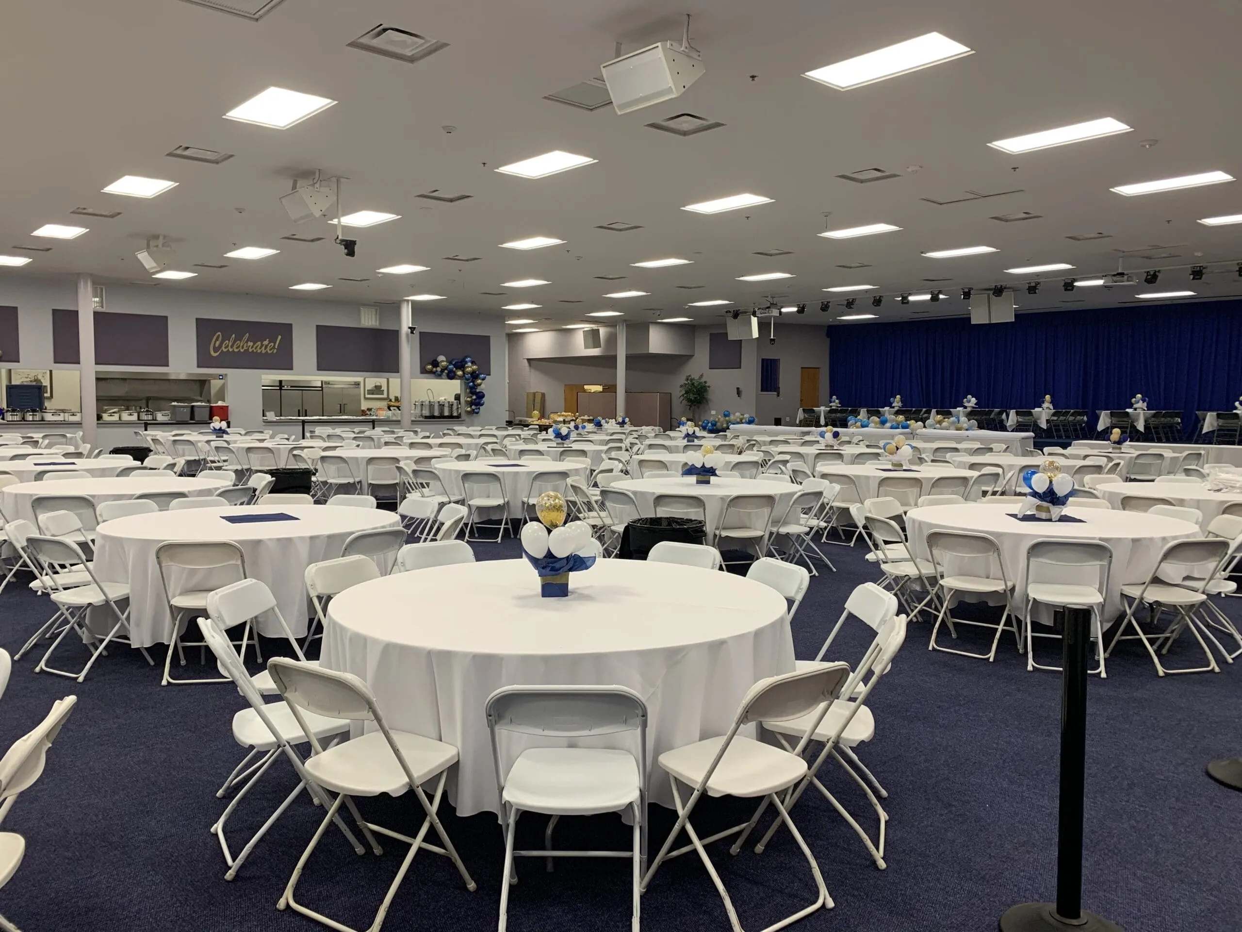 Barnes Design Group partnered with Potter’s House to transform an existing sanctuary into a modern, multifunctional fellowship hall designed to foster connection and community. The renovated space comfortably accommodates up to 700 people with flexible table and chair configurations and is supported by a fully equipped commercial kitchen to serve large gatherings and events.